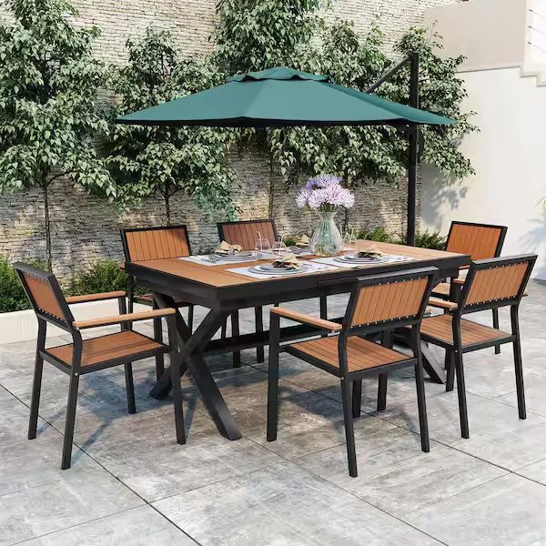 Create a stylish and flexible outdoor dining space with this black 7-piece American-style dining table set. Featuring an extendable table and six comfortable chairs, it easily adjusts to accommodate family meals or larger gatherings. Built with weather-resistant plastic wood and sturdy metal frames, this durable set offers long-lasting outdoor performance with a sleek, modern look—perfect for patios, decks, and poolside entertaining.