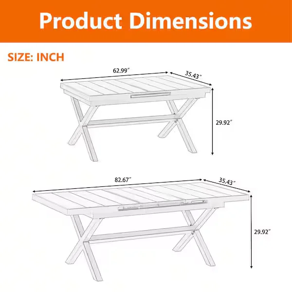 Transform your patio into a vibrant gathering space with our 7-Piece American Style Outdoor Dining Table Set. Designed for both style and practicality, it features six ergonomically designed chairs and a spacious extendable table, crafted from weather-resistant plastic wood and supported by sturdy iron frames. The table smoothly extends from 62.9 in. to 82.6 in. easily accommodating additional guests for everything from casual breakfasts to festive dinners. The set is built for long-lasting performance outdoors, offering a sleek, modern look that’s as functional as it is durable. Whether you’re enjoying a quiet evening or hosting a lively barbecue, this dining set adjusts to fit your lifestyle.