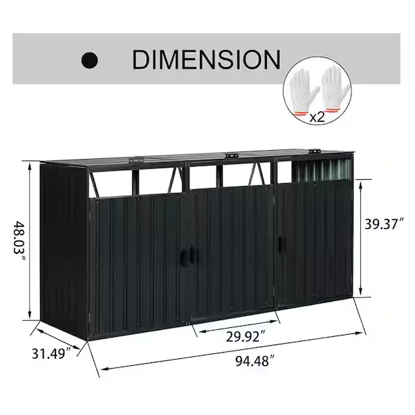 Keep your outdoor space clean and organized with this black galvanized steel trash can storage shed. Built from reinforced, rust-proof metal, it’s designed for long-term outdoor use while neatly concealing up to three trash bins. The ventilated design helps reduce odors, and the spring-assisted lid with front-opening doors makes access easy. Durable, secure, and easy to clean, this bin shed adds both function and a polished look to your garden, patio, or driveway.